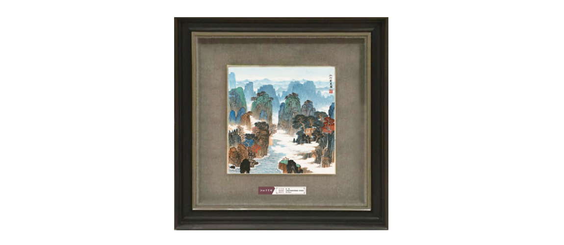 2)艺术品原作概况:由瀋陽所作工笔山水小品《江山万里图》,绘于原装进口日本镜片。原作题材取自中华民族的名山大川、气势恢宏、重峦叠嶂;用笔线条勾回繁复、苍劲有力、浓淡相宜;重彩设色十分考究,通过矿物颜料反复研磨、尝试、晕染,整体感浓重而瑰丽、沉稳而静谧;画面所现云雾、山峰、古树、瀑布、溪涧空间分布错落有致,前景礁石、亭阁细致而有趣味、中景山峦层层叠叠、远景云天清奇缥缈,尽显中国工笔山水的魅力。