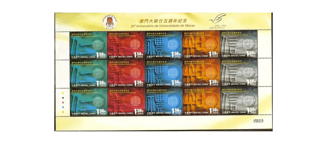 澳门邮政于2006年9年28日发行《澳门大学二十五周年纪念》邮票五枚。澳门大学的诞生可追溯到1981年3月。当年Ricci Island West有限公司获澳门政府批租土地,创办澳门首间大学——私立东亚大学,也就是澳门大学的前身。东亚大学的创立,标志著澳门现代高等教育的开始。